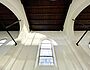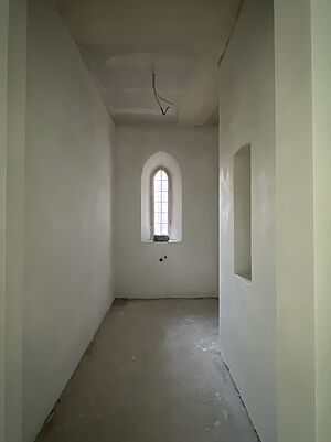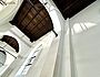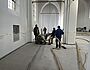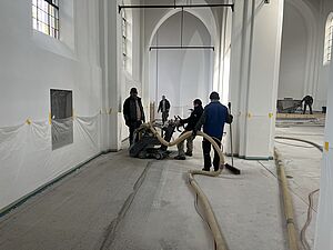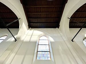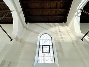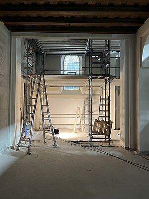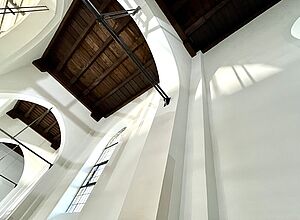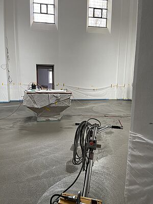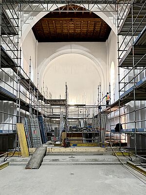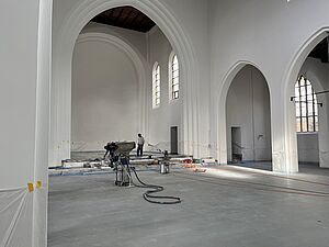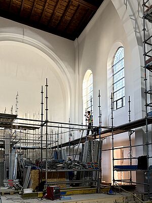 Die großen weißen Vorhänge wurden ausgebaut. Aktuell wird über eine professionelle Agentur im Sinne des zirkulären Bauens ein Abnehmer für sie gesucht, damit sie wiederverwendet werden können. Inzwischen sind auch die Möblierungen und alten Bodenbeläge ausgebaut und die Wände für den neuen Putzvorbereitet und von loser Altfarbe befreit worden. Noch in diesem Jahr soll der Anbau zur Kaplanei ein neues Dach erhalten und die Bodenplatte im Kirchenraum ausgebaut werden, damit im neuen Jahr Versorgungsleitungen verlegt und eine neue gedämmte Bodenplatte mit Fußbodenheizung eingebaut werden kann.