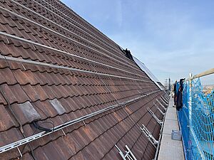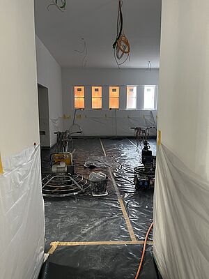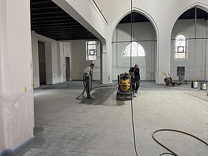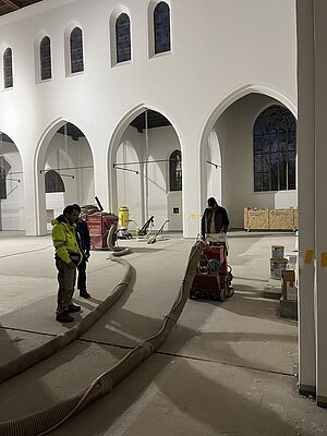 In den vergangenen Wochen ist auf der Baustelle richtig viel passiert. Einer der größten Schritte war der Einbau des Sichtestrichs in der Kirche. Damit der neue Boden am Ende so aussieht und funktioniert, wie er soll, war einiges an Vorbereitung nötig: Der Untergrund musste aufgeraut, fast 500 Meter Fugenprofile gesetzt, der Spezialestrich in einer dünnen Schicht aufgetragen, geglättet, geschliffen und schließlich versiegelt werden. Auf dem Dach ist inzwischen die Photovoltaikanlage montiert. Die Wärmepumpen, die schon seit einiger Zeit vor dem Turm stehen, wurden angeschlossen, und auch die Leitungen für Wasser und Strom sind inzwischen verlegt. Der Ausbau der WCs ist abgeschlossen. Dort können jetzt die letzten Ausstattungen eingebaut werden. Sobald der Estrichleger seine Arbeiten abgeschlossen hat, kommt der Schreiner und baut die Möbel ein, während die Installateure Lampen aufhängen und die Heizkörper montieren. Man merkt: Wir sind richtig auf der Zielgeraden!