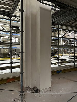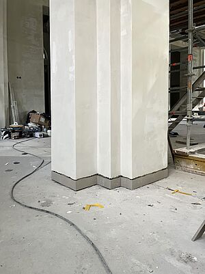 Der Umbau von St. Nikolaus macht sichtbare Fortschritte. Nach der Sommerpause stehen die Putz- und Spachtelarbeiten im Mittelpunkt. Dafür wurde ein beeindruckendes Raumgerüst errichtet, das nun den gesamten Kirchenraum ausfüllt. Die Putzarbeiten werden schon im November abgeschlossen. Auch außen ist einiges passiert: Die Ergänzungen am Putz der Chorfenster sind fertiggestellt. Damit kann die Attikaabdeckung vollendet und anschließend der Dachgarten mit Terrasse angelegt werden. Im Innenbereich sind die WCs inzwischen vollständig verspachtelt. Als nächstes steht der Bodenausgleich an, bevor gestrichen und gefliest werden kann. Ein weiterer Meilenstein wurde Ende Oktober erreicht, denn die Wandnischen wurden eingebaut. Es fügt sich Schritt für Schritt das Raumbild zusammen – und die neue Gestalt von St. Nikolaus wird immer deutlicher sichtbar.