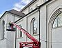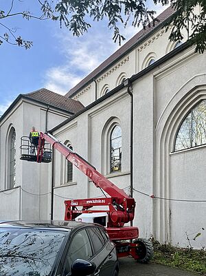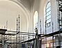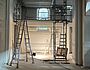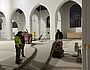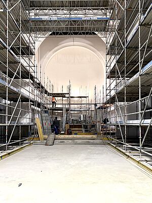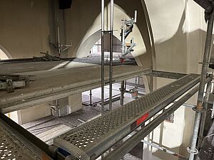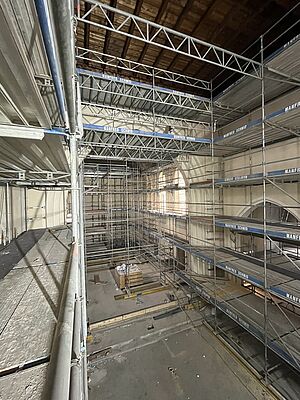 Der Estrich wurde in allen Bereichen der Kirche eingebaut. Jetzt steht ein riesiges Gerüst im Kirchenraum um die verschiedenen Bauabschnitte optimal zu erreichen. In den Nebenräumen wurden letzte Kabel verlegt und Wände geschlossen. Außerdem haben die Stuckateure bereits mit Vorarbeiten begonnen um im nächsten Arbeitsschritt die Wandoberflächen mit einem neuen Innenputz zu versehen, damit die Kirche nach der Renovierung hell und freundlich erscheint. Im Bereich der WCs wurden die Putzarbeiten, die Integration von Technik und die Abstimmung der Materialien fertiggestellt, damit alles später perfekt zusammenpasst. Außerdem wurden alle Kirchenfenster mit Hilfe von Steiger und Kran von außen saniert und mit neuen Gläsern versehen. Die Kunstglaser werden im nächsten Arbeitsschritt die innenliegenden Bleiverglasungen der Kirchenfenster instand setzen. Insgesamt befinden wir uns weiterhein auf gutem Kurs zum Umbau der Kirche und haben aktuell keine relevanten Verzögerungen im Bauablauf.