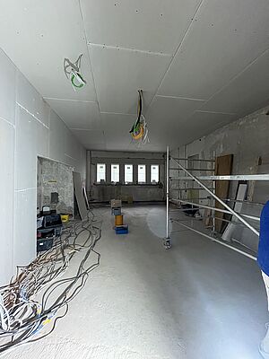 Die Bodenplatte ist vollständig fertiggestellt. Die neuen Windfänge und Wandnischen sind nun gut erkennbar und verleihen dem Innenraum bereits eine neue, klarere Struktur. Zahlreiche Wanddurchbrüche wurden geschaffen oder geschlossen – alles verläuft planmäßig. Besonders erfreulich: Die Rohinstallationen für Sanitär- und Heizungsanlagen sind weitgehend abgeschlossen. Ein ganz besonderes Highlight ist derzeit das erste Muster einer der neuen Zugstangen, die in den Mauerwerksbögen eingebracht wurden. Sie sind ein wichtiges Element für die zukünftige Flexibilität der Raumgestaltung – und geben schon jetzt einen spannenden Ausblick auf das, was kommt.